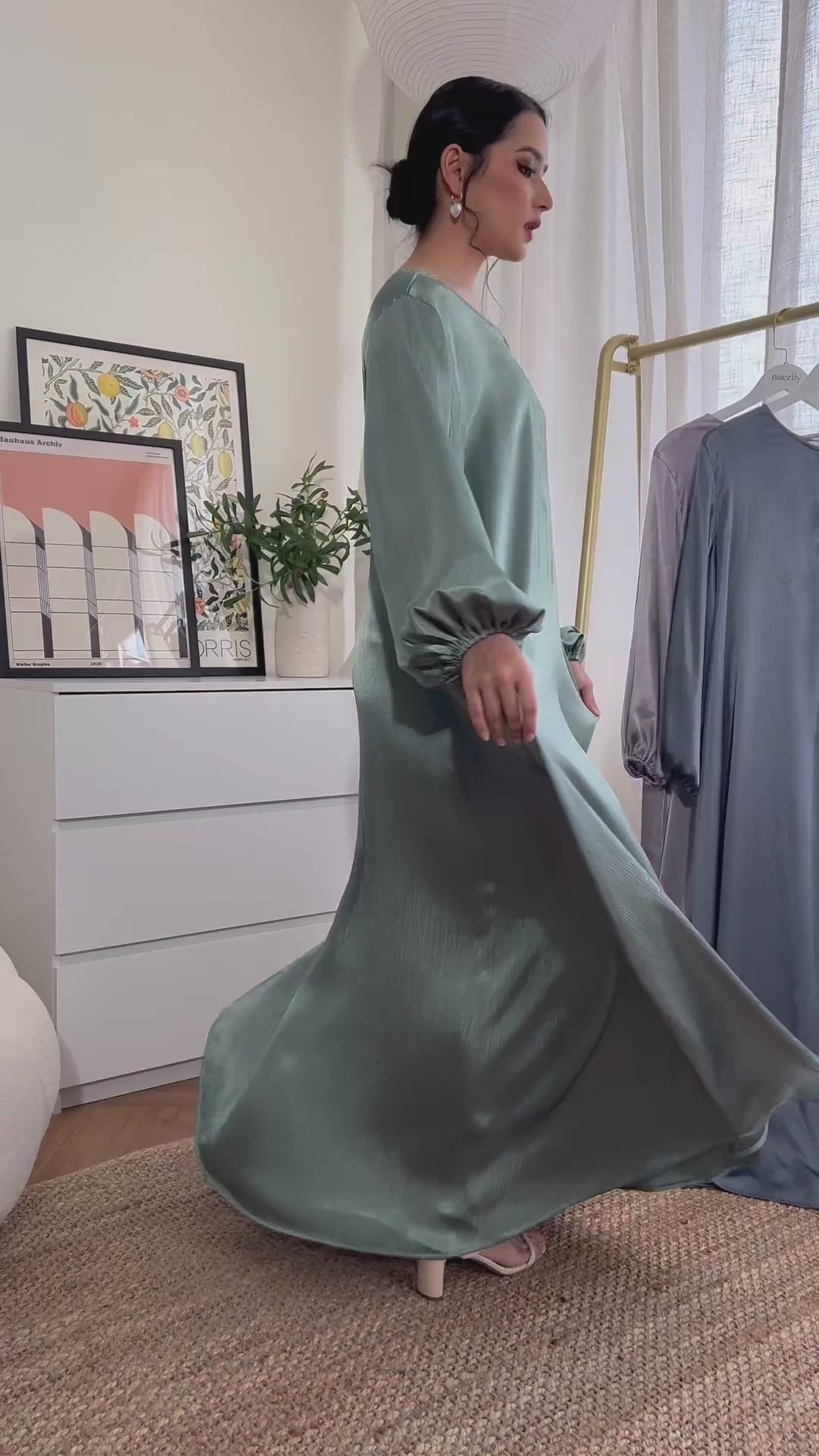 Satin A-line maxi dress with bishop sleeves and elastic cuffs. Non-sheer, textured fabric that is flowy and drapes beautifully. Zip enclosure that can be worn in the front or back. Perfect for breastfeeding mummies!