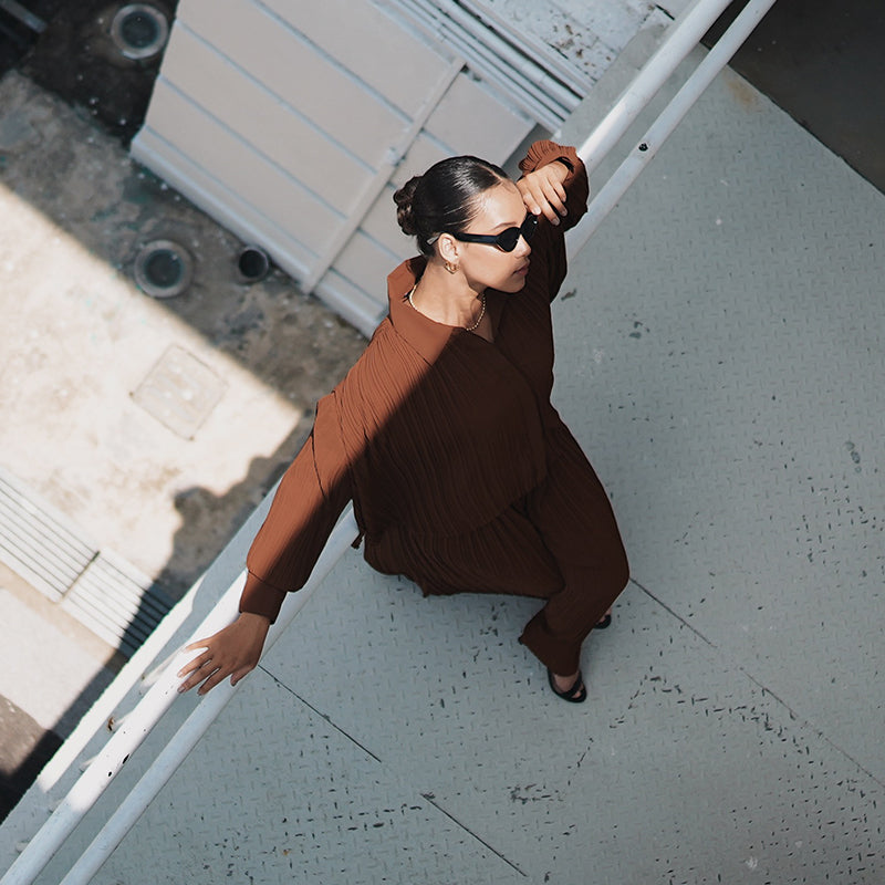 The Jackie set flaunts a two-piece ensemble of a button-down shirt and wide-legged trousers, constructed from the brand's signature pleated chiffon. Lined for added coverage, the Jackie shirt has a collar, dropped shoulder, and long sleeves with concealed front buttons. The Jackie trousers showcase a wide-legged cut and stretchable waistband for a relaxed fit.