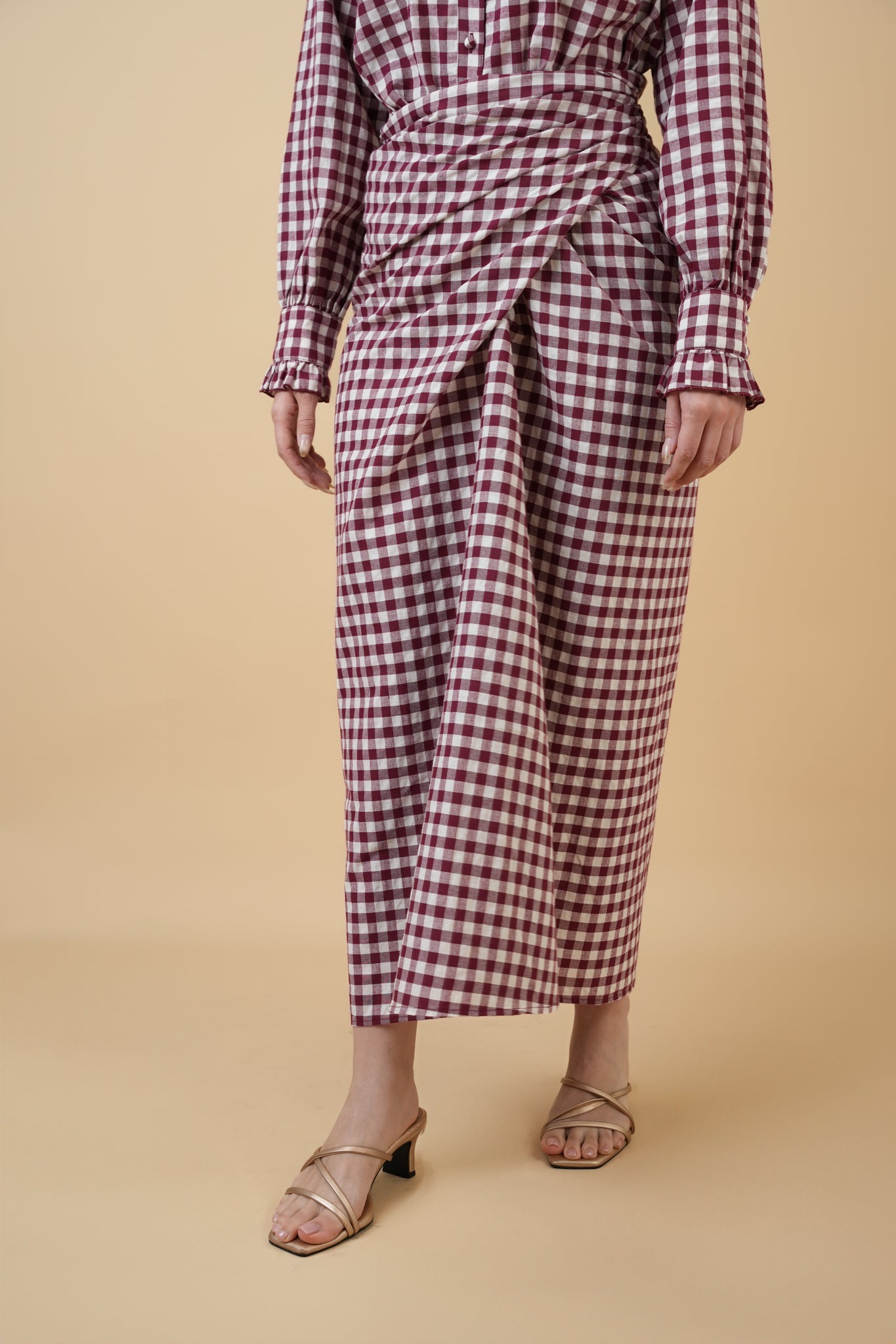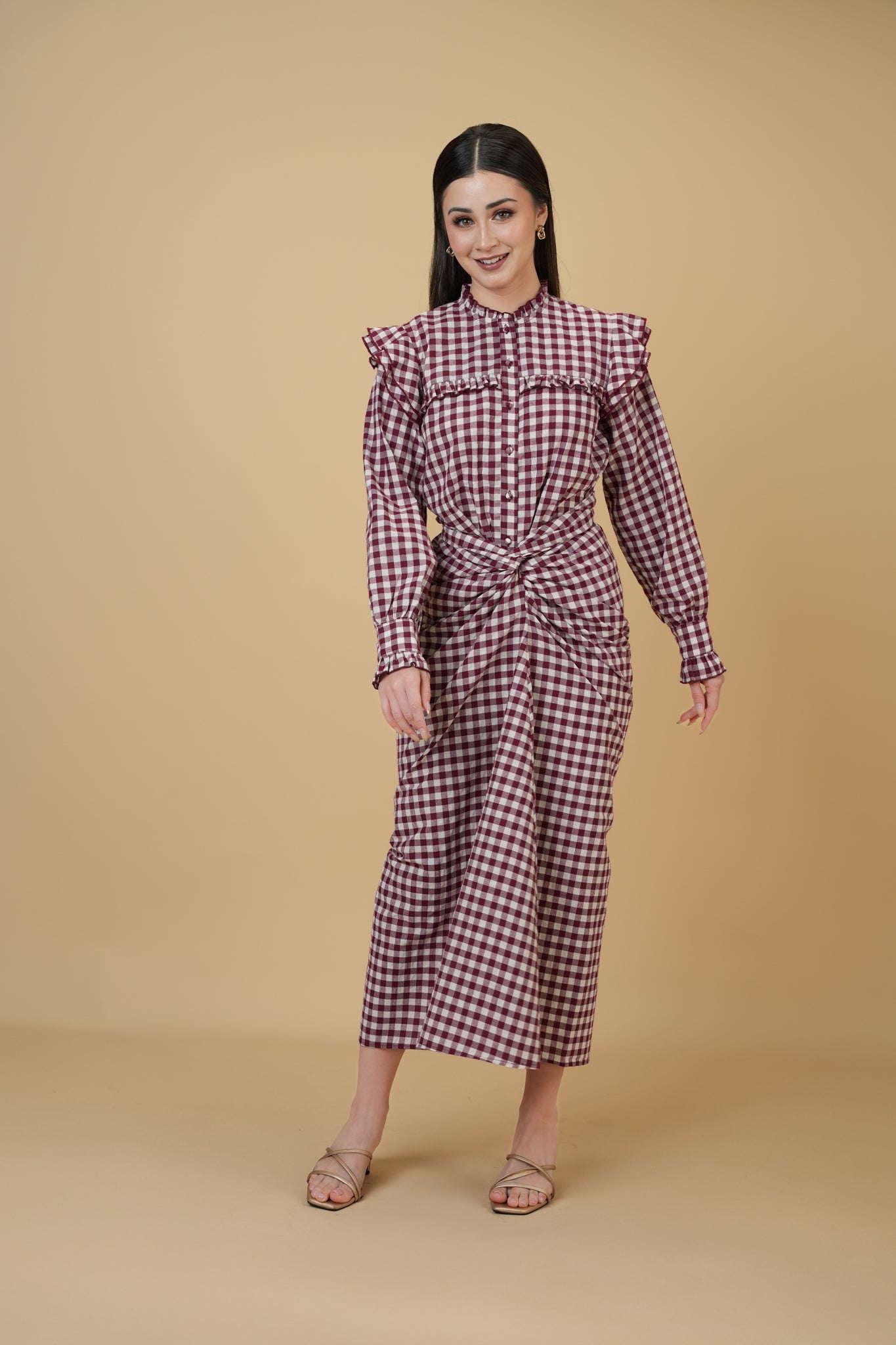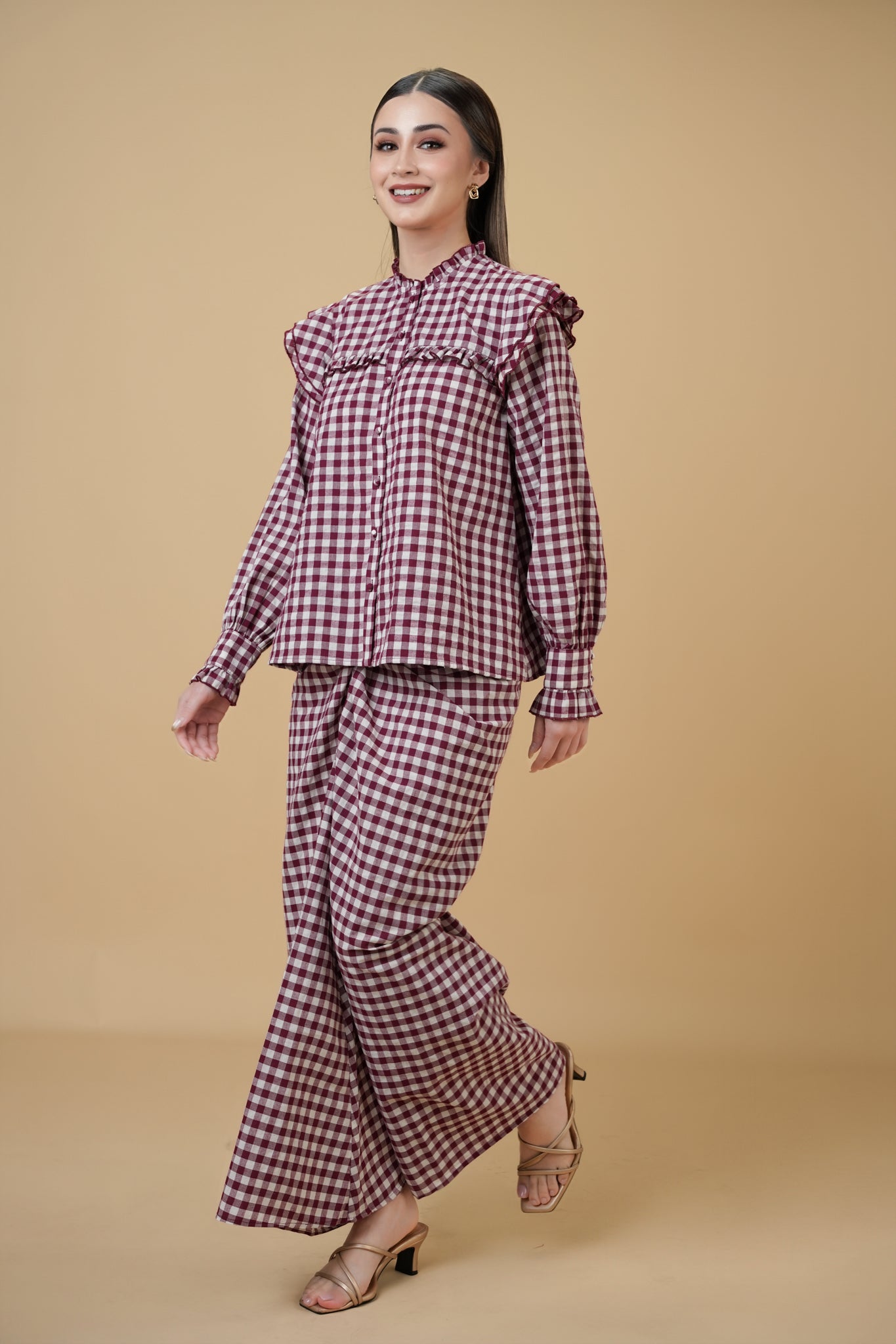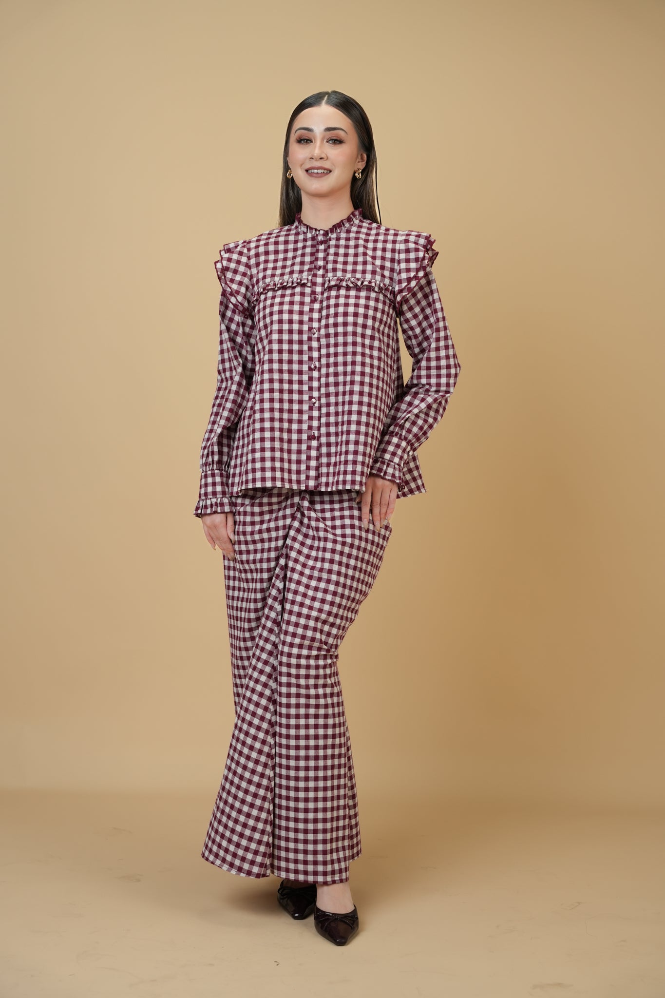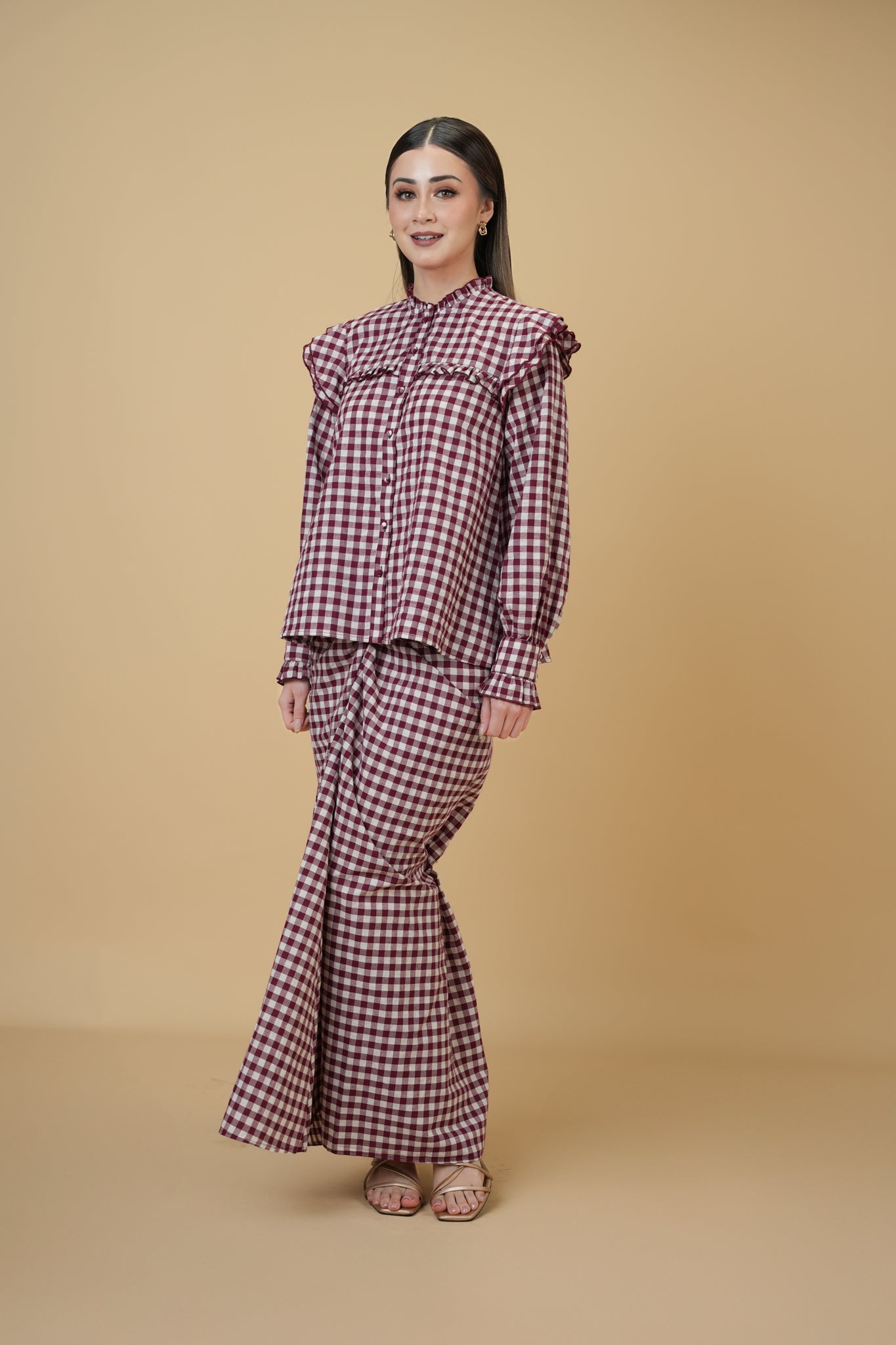 The Shamin Modern Kurung offers a playful, vintage-inspired look with a checkered two-piece design, made from comfortable cotton material.